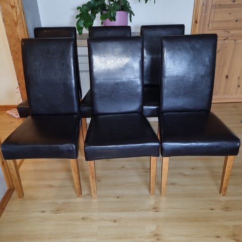 Stabila och bekväma stolar med hög rygg och skön stoppning. Tidlös design som passar lika bra runt matbordet som i konferens- eller restaurangmiljö. Mörk klädsel som är lätt att hålla ren och gedigna träben som ger bra stabilitet. Använda men i gott skick.