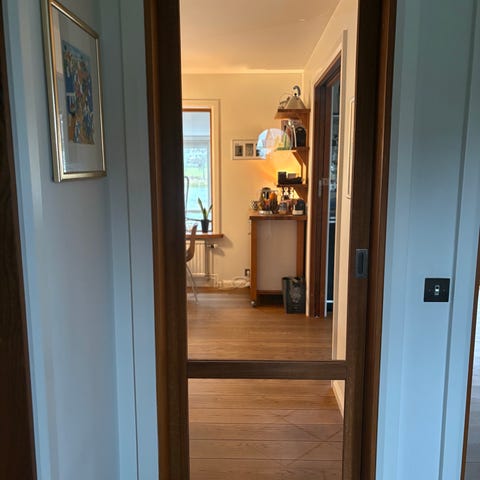 Set med en-suite skjutdörrar med vackert blyinfattat glas.