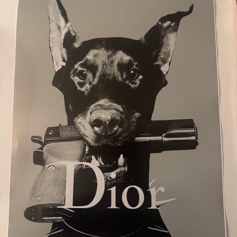 Dior poster med motiv av en svart hund som håller ett föremål i munnen. Postern är i svartvitt och visar Dior-logotypen.