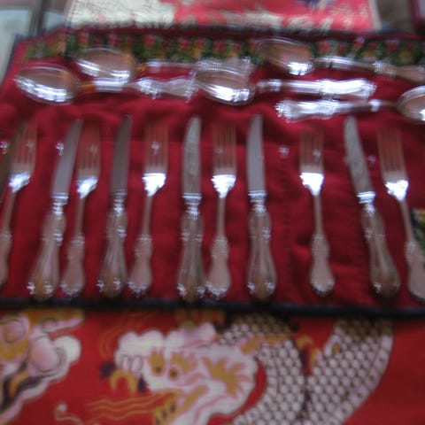 6 förrättsgafflar, knivar & skedar.