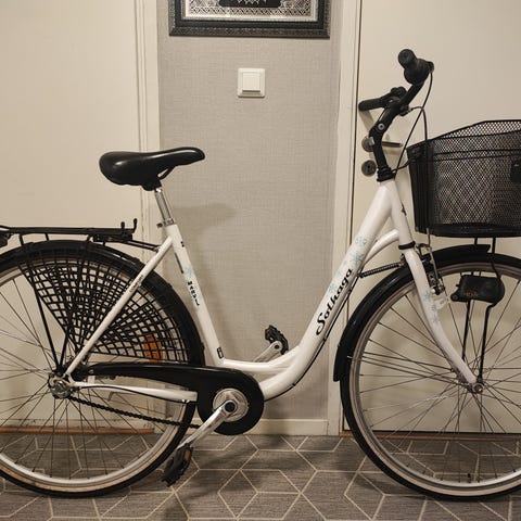 1. röd Sierra damcykel, 28 tum, 7 växlar, fotbroms, pris 2200kr.