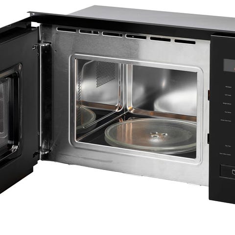 Vit Inbyggnadsmicro med silverfärgade detaljer. Fullt fungerande. Säljes enbart pga. Köksrenovering.