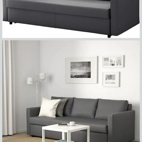 IKEA Bäddsoffa/150 Soffa / 200, i ljus beige tyg. Soffan har en rak rygg och sits med klädsel i tyg.