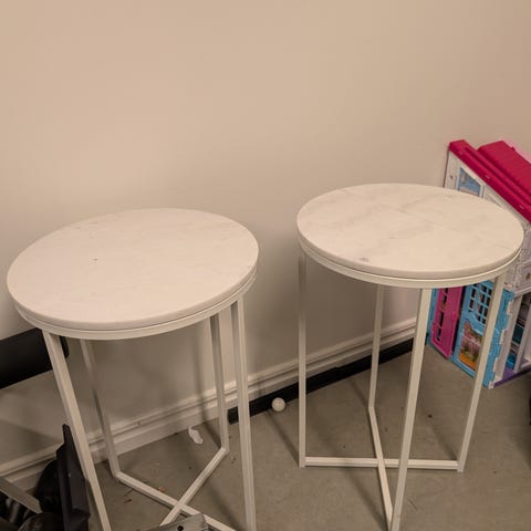 Mindre sidobord i marmor med en topskiva i målat trä. Basen är marmor