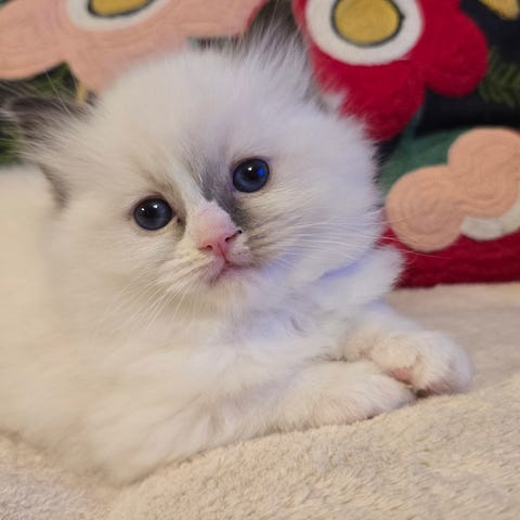 Kattunge föddes den 24/9 och kan hämta när du vill Hon är sociala, lekfulla, rumsren och älskar att mysa med människor. Ragdoll-kattunge är kända för sin blå ögon och silkeslena, halvlånga pälsar.