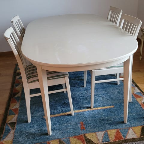 Matbord i trä med oval form och fyra matchande trästolar. Bordet och stolarna har en ljus träfinish och är designade för matplatsen. Passar för vardagsrum eller kök.