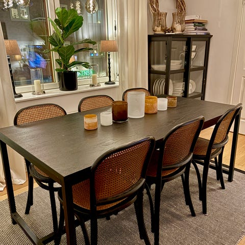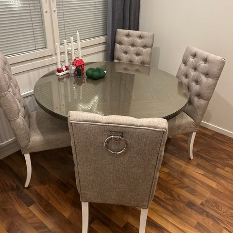 1st Matbord i härdat glas med ett underrede i metall.Rökfärgat glas med underrede i svartlackerad metall