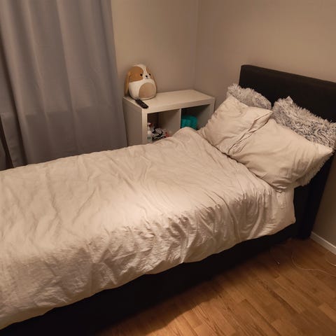 90×200 säng med förvaring, köpt på ikea och heter släkt. Nypris 3495 kr. Det finns skav vid huvuddelen och bendel.