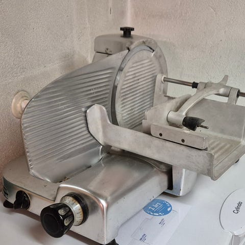 Mado Kylmäkoneet skärmaskin i rostfritt stål med inbyggd knivskydd och justerbar skärbredd. Maskinen är avsedd för skivning av kött och charkuterier i kommersiella eller privata kök.