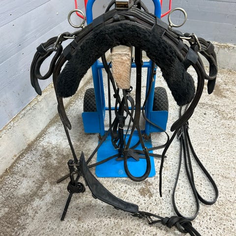 Loksele passande ponny. Använd av russ senast. Lokor ca 50 cm från övre- till nedre lokrem. Dragläder ca 40 cm. Ingen baksele finns. Början till sprickor i svanskappan.