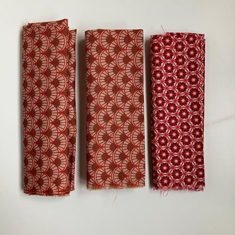 Flera tygrullar i olika färger inklusive beige, röd, grön och mönstrad gul. Tygerna är av varierande material och texturer, lämpliga för olika syprojekt och inredningsändamål.