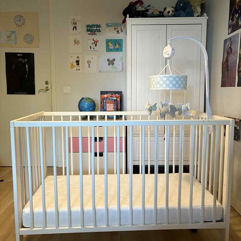 IKEA Spjälsäng barnmöbel i vit färg. Passar för små barn och är tillverkad i hållbart material. Utformad för att ge en säker sovplats för barn.