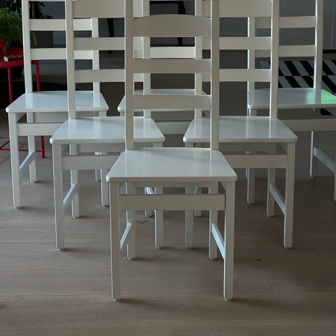 Sex stycken vitmålade köksstolar med träsits.