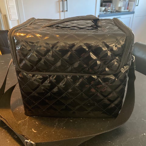 En helt ny, oanvänd, superpraktisk fransk kvalitetsväska när du vill ta med en massa skönhetsprodukter och smink på resan. Väskan som är superlätt har ett hårt yttre hölje och två stora fack som vardera stängs med blixtlås. Inuti väskan finns flera små fack och hållare som ser till att flaskor mm står upprätt. Väskan ger en god överblick över allt som är med. Den har bärhandtag, avtagbar axelrem och en rem/hållare/fäste på baksidan så att du enkelt kan sätta den på din trolley/resväska. Mått L:35, H:25, B:20. Färg utsida:svart. Färg insida: Grå. Rök- och djurfritt hem. Nypris 900 sek.