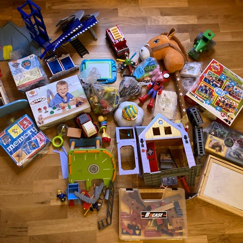 Finns böcker, dockor, pussel,byggsatser mm.