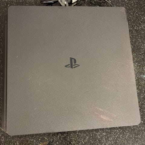 Sony Playstation 4 spelkonsol i svart färg. Inkluderar en handkontroll och nödvändiga kablar för anslutning och laddning.