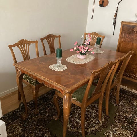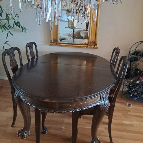 Säljer ett stort och elegant antikt matbord i massivt trä med vackra detaljer och stabil konstruktion.