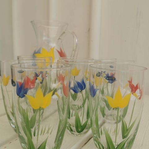 kosta Boda glas och karaff set med blå och rosa dekor. Setet inkluderar flera glas och en karaff, alla med färgglada dekorativa mönster i blått och rosa. Materialet är glas. Passar för servering av drycker.