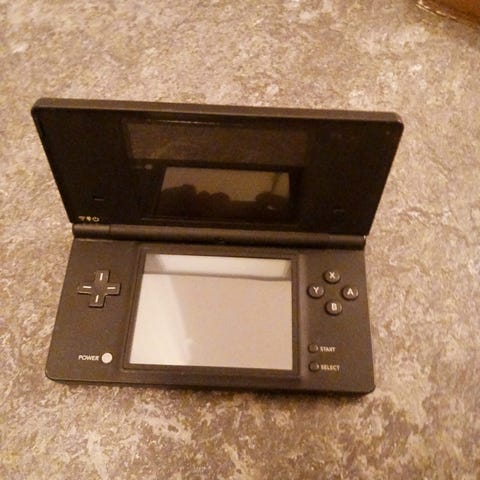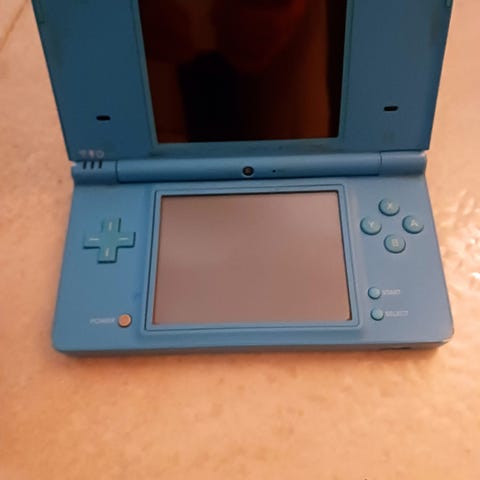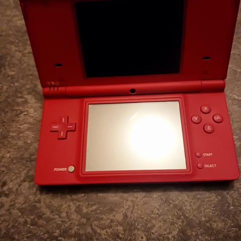 Nintendo DSI XL spelkonsol i röd färg. En laddare ingår till den som kopplad till USB A uttag, en repa på nedre skärmen finns. (Moddad spelkonsol)