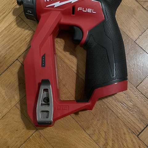Milwaukee M18 BLDD borrmaskin med röd och svart färg. Batteridriven modell avsedd för borrning och skruvdragning.