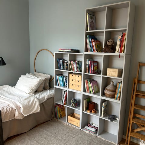 Pga flytt säljs 2 st eket hyllor i färg grå med tillhörande väggskena.