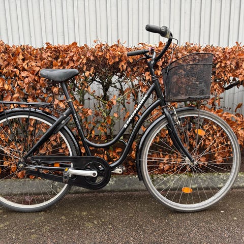 Landsvägscykel för kvinna i lila färg. Cykeln är utrustad med korg framtill och pakethållare bak. Den har en låg instegsramp för enklare på- och avstigning köpt för 2 år sedan för 4000kr används jätte lite och den står här bara lås nyckeln finns priset för cykel 1500kr för mer info och bilder ring 0701596524 den är 28 tums