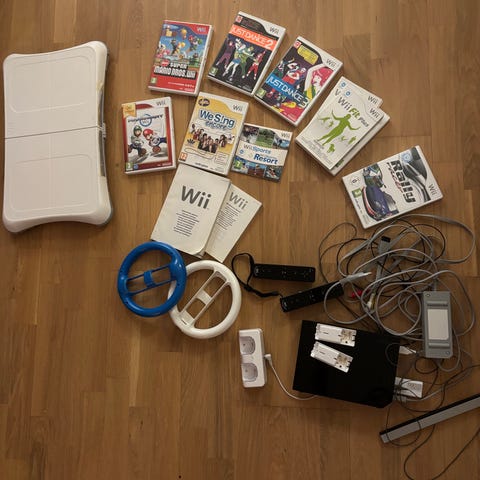 Nintendo Wii spelkonsol med tillbehör och spel, två vitpistoler och nödvändiga kablar, och sensor baren. Paketet innehåller även fem spel + Wii sports.