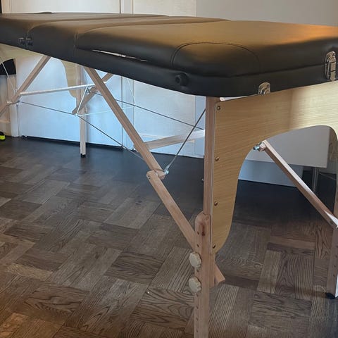 En fullt fungerande massagebänk, justerbar på flera sätt samt elektriskt höj och sänkbar.