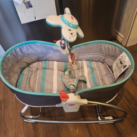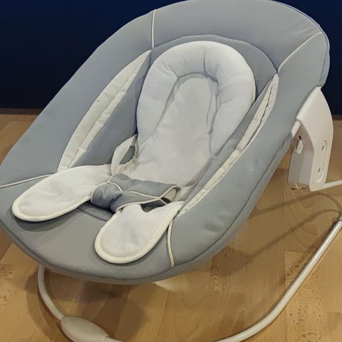 Både en babysitter och vagga. Babysitterns rörelser vaggar bebisen och har tre olika, fällbara lägen. Den har höga kanter vilket ger barnet en säker och bekväm plats.