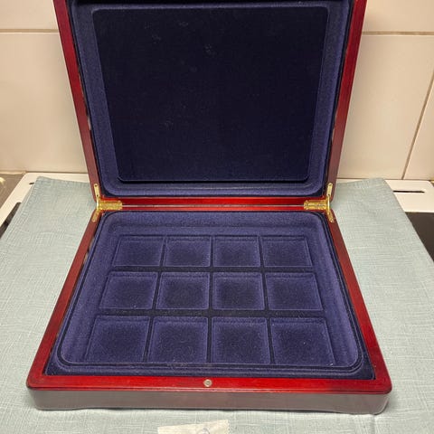 Ricks Mynt förvaringsbox i svart färg med lås. Boxen är tillverkad av hårt material och har en grön insida. Den är utrustad med en låsmekanism framtill och levereras med flera ark med cirkulära mönster i blått och vitt. typ mynt från 1818 till 1973