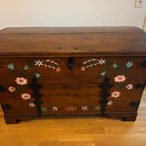 Stilren och praktiskt träkista för förvaring. Locket är låsbart med nyckel, och på sidan finns två mindre fack för småsaker, se bild. Yttermått: längd 106 cm x höjd 62 cm x djup 50 cm.