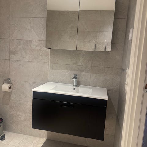 Hela kittet på bilden. Från 96 men väldigt sparsamt använt och i fint skick. Spegel och kommod 160 långt. Varje högskåp är 30 cm brett.