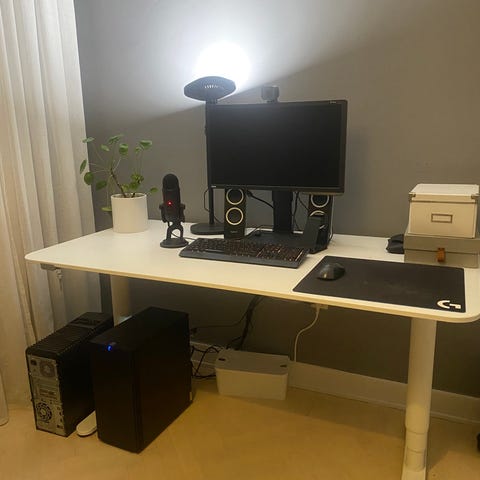 Stilrent elektriskt höj- och sänkbart skrivbord. Ljus bordsskiva med svart underrede. Fungerar felfritt!