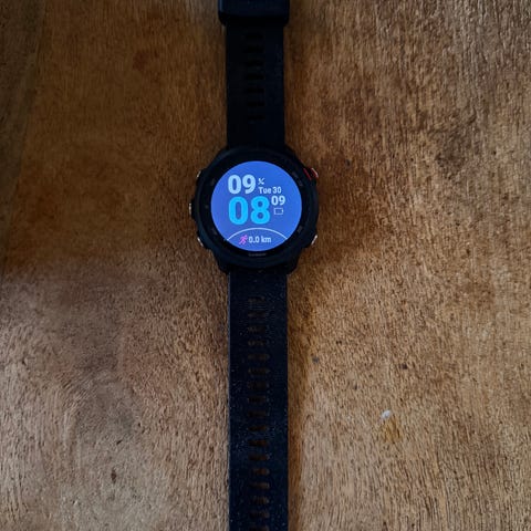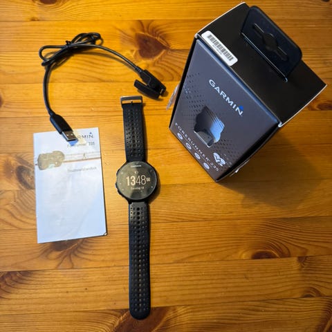 Garmin Forerunner svart armband. Klockan har en rund digital display och är designad för sport och utomhusaktiviteter. Bandet är justerbart med flera hål för anpassad passform.