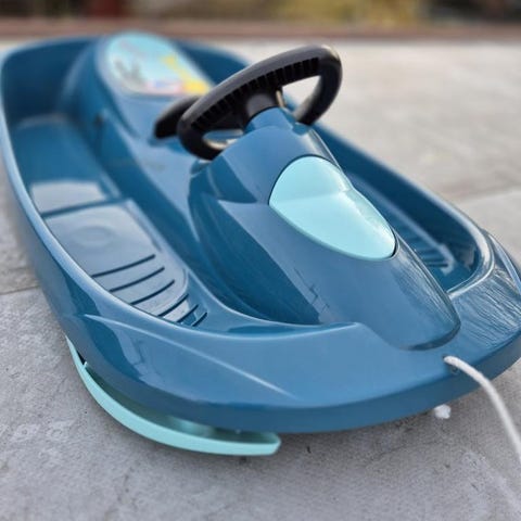 Blå pulka i enkel design, lämplig för vinterlek och pulkaåkning.