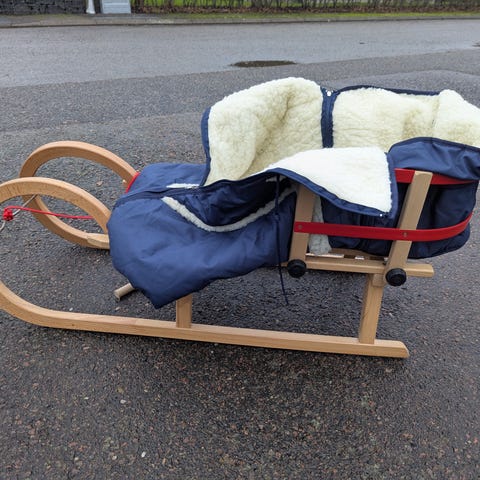 Blå plastkälke i enkel design, lämplig för vinterlek och pulkaåkning.
