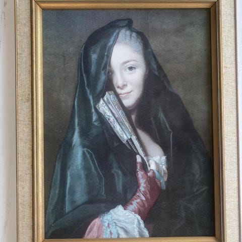 Tryck på duk monterad i originalram med guldfärgad ytterram och innerlist.