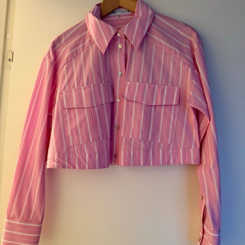 En fin rutig skjorta blå rosa och vit med volanger på framsidan . Köpt från zalando och används få gånger .