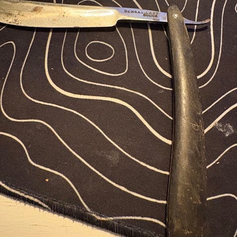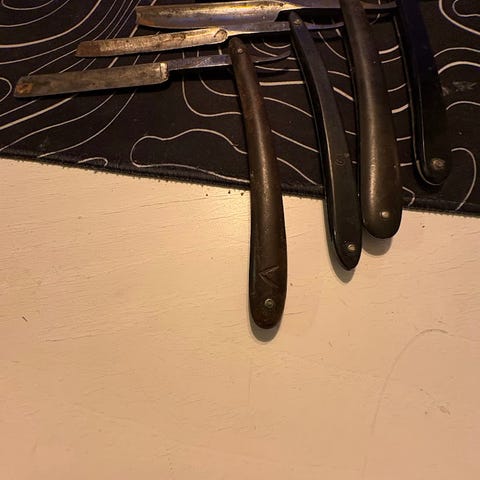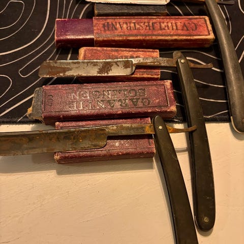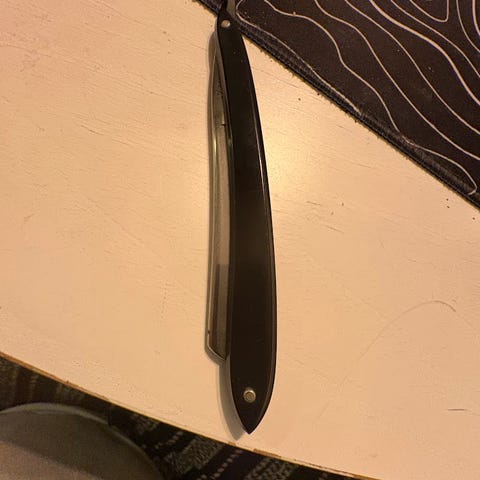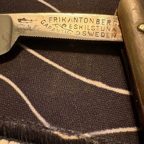 Atlas 10/8 rakkniv med en bladbredd på 10/8 tum och gul handtag. Rakkniven är avsedd för rakning och kommer med en förvaringsask i trä.