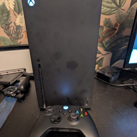 Xbox Series Xbox Series X spelkonsol med en svart handkontroll och strömkabel inkluderade.