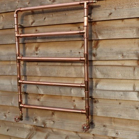 Väggmonterad handdukshängare i trä och metall med fyra armar. Designad för att hänga och torka handdukar eller liknande textilier. Monteras på vägg och har en naturlig träfärgad bas med metallarmar i silverfärg.