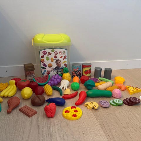 Leksaksmatset som inkluderar en grön plastkorg och olika frukter och grönsaker i plast, lämpligt för barnlek.