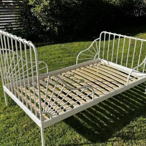 IKEA juniorsäng i vit färg. Sängen är avsedd för barn och har en ram med spjälor. Passar som juniorsäng i barnrum.