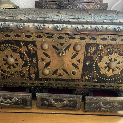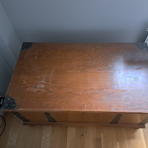 En charmig och mycket rymlig grå kista i massivt trä, med naturlig platina. Troligtvis tillverkad sent 1800-tal, då den har sinkade hörn (synliga tapp-/sinkfogar), vilket tyder på traditionellt hantverk.