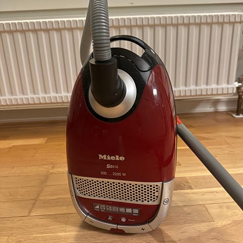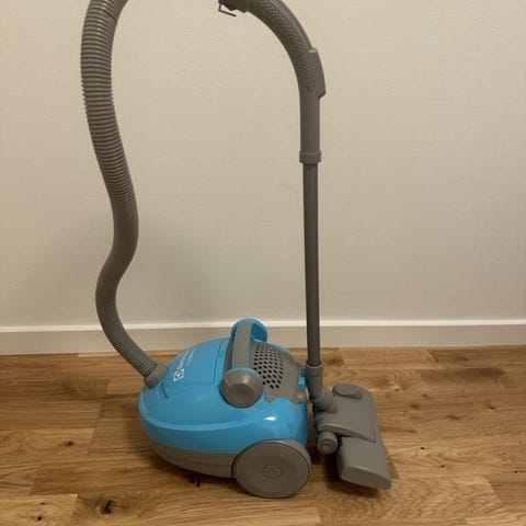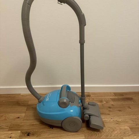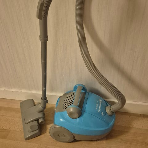 Dammsugare i rosa färg med flexibel slang och två munstycken för olika rengöringsändamål. Enheten är kompakt och bärbar, lämplig för hushållsbruk.