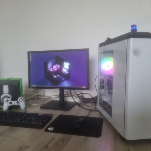 tillbehör med skärm mus o tangentbord samt razer gaming hörlurar.