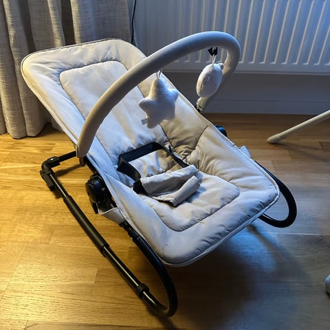 Babysittern har två reglerbara lutningspositioner perfekta när barnet behöver vila och sova. Babysitterns gungfunktion används genom medföljande strömsladd, alternativt genom AA-batterier.