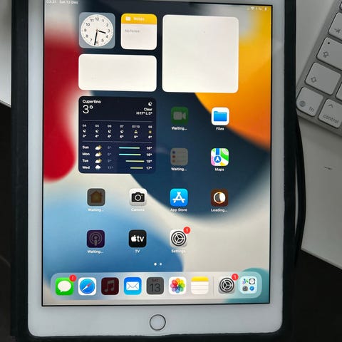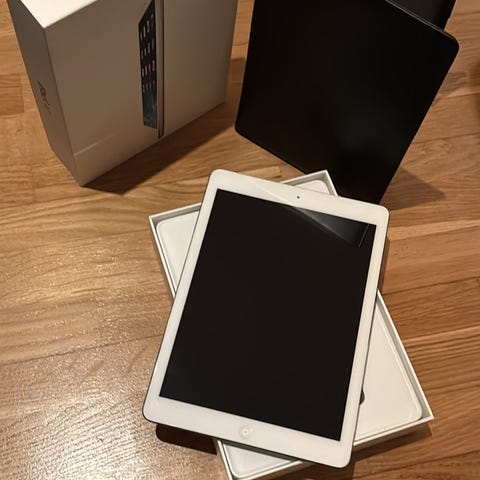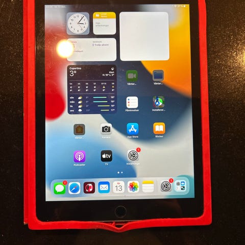 Apple iPad med 16 GB lagringskapacitet. En surfplatta med en skärm skyddad av ett blått fodral med handtag, vilket underlättar hantering och skydd. Enheten levereras med laddare samt fodral