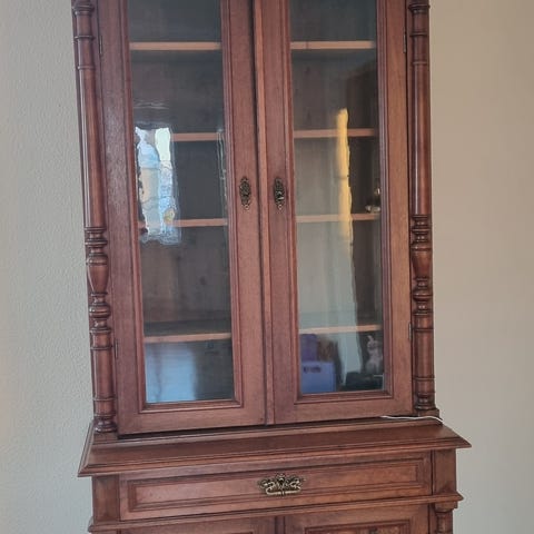 Originalglaset har den vackert lätt vågiga karaktär som är typisk för äldre möbler. Skåpet är stabilt men har synligt åldersrelaterat slitage.