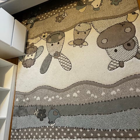 Jollyroom Barnlekpark med grått tyg och färgglad bottenmatta
